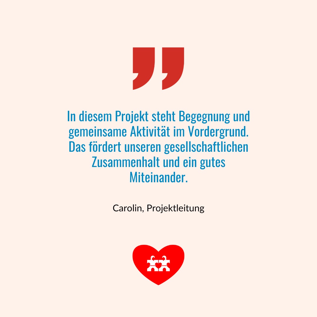 Die Angebote unseres Projekts „Stadt trifft Herz“ werden von unserem hauptamtlichem Team begleitet und kommunikativ unterstützt. Dabei werden sowohl neue Ehrenamtliche und Engagierte, als auch neue Vereinsmitglieder und Spender in die Vereinsgemeinschaft aufgenommen. Das zahlt auf unsere langfristige Strategie ein, in der wir unsere Arbeit in Hamburg verstetigen und ausweiten wollen.